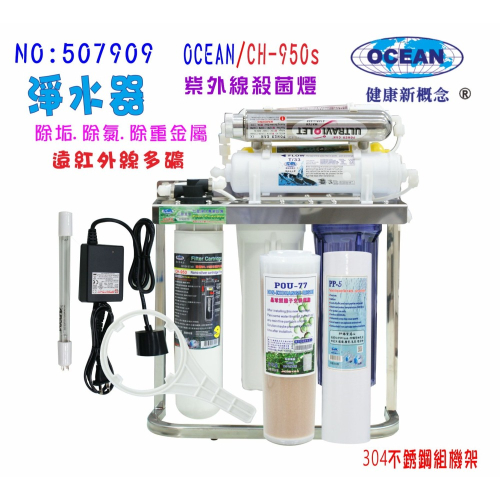 相關性污染物的淨化效能可濾除大於萬分之一公分的雜質、微生物、浮游物、石棉纖維、異味、異色、餘氯、漂白水、三鹵甲烷 囊胞菌、致癌物等有毒污染物 適用濾頭:可與3MEverpure.卡式濾頭共用 H-104.S-104.S-100.S-54 MC.MH.CFS9112.CFS9812X CFS9812XS.CFS9812ELX OCEAN- CH950同款式可更換用. 總過濾量:33138公升流速每分鐘8.5公升.比較功能等級 最高耐壓:120PSI CH-950內材質說明:1. PP綿過濾孔徑1微米/m 2.優點高精密椰殼壓縮活性炭.3.抑菌銀活性炭4.除重金屬氧化離子KDF銅鋅合金.5.小分子遠紅外線陶瓷球)6. 高科技奈米銀布合金銀布 第一道 10’棉質PP濾心--- (過濾孔徑-二層製法內層1m外層5m) 第二道 10”英國PUROLITE離子交換樹脂濾心-長型 第三道 CH-950s奈米淨水器 第四道 KT椰殼活性炭濾心 第五道ST麥飯石濾心 第六道ST小分子遠紅外線陶瓷球濾心 第七道1G-UV紫外線殺菌燈組外線殺菌燈組 復合式多效家/商業用專用淨水器 配件:304白鐵鵝頸龍頭、3分考克、4分進水三通、3分PE管6米.6 吊片.