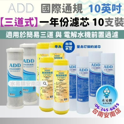 【三道式淨水器 一年份濾心10支】 功用:一般三道的淨水器用濾心一年份 產品內容: ADD-PP 10英吋5微米 * 4支 ADD無溶劑樹脂濾心 * 4支 ADD-CTO濾心* 2支 ★附贈把手1支 詳細規格: 1、ADD-PP  尺寸:長10英吋(9.7/8”)國際標準規格  圓徑:62nn+-1mm  孔徑:5微米  更換時間: 3個月更換一次  納污量大、攔截率高  產地:台灣 2、ADD-EDF無溶劑樹脂濾心  尺寸:長25公分10英吋(9.7/8”)  圓徑:外圓徑70mm、內圓徑28mm  內容量:0.7公升樹脂  功用優點:使用通過多種認證軟水樹脂,品質有保證。       不會釋出化學溶劑,可重覆還原使用,  交換率高,有效軟化水質  濾心產地:台灣  原料產地:中國 3、ADD-CTO壓縮式活性碳濾心  濾心尺寸:10英吋長、高25公分、圓徑7公分  功能:過濾去除三氯甲烷、氯、VOCs揮發性有機物、     有害化學物質、惡臭味、農藥  過濾孔徑:5~10微米(microns)  材質:純天然椰殼活性炭  適用範圍:使用於各式淨水器的第二道或第三道過濾  最大工作壓力:120PSI  最高工作溫度:60°  使用壽命:依據各地區水質及用水量不同,當水質濁度       小於1NTU時,可過濾3500加崙  產地:台灣  製造商:東森水處理股份有限公司    通過NSF-ISO-9001認證工廠 ※因包材重量限制,超商寄貨只能寄送一件,故下標時請選1唷,謝謝! 若需要其他商品一起寄送,請先與我聊聊唷! 🌷🌷🌷樹脂商品怕熱,建議放置陰涼處,避免放置高溫或者太陽直曬處,容易導致樹脂變質 🌷🌷🌷新品未使用樹脂請放置在冷藏10度C以下環境,可保存3年 🌷🌷🌷樹脂商品屬性特殊,有保存環境、溫度、期限問題,無法因保存不良而接受退換貨。