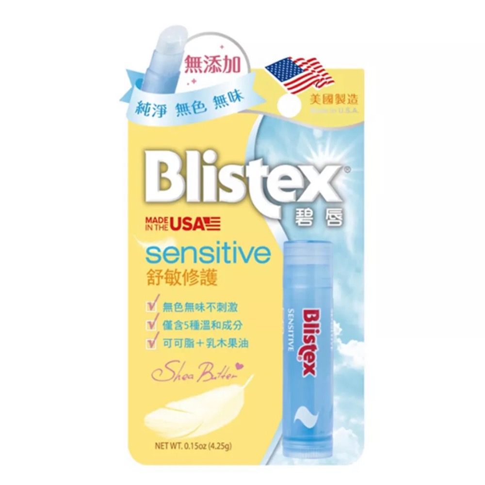 可可脂+乳木果油 僅含5種成份 安心呵護 商品名稱:《碧唇Blistex》舒敏修護潤唇膏(4.25g) 容量:4.25g 妝廣字號:北市衛粧廣字第105100363號 保存期限:3年 使用說明:將唇膏轉出約3mm,塗抹於雙唇。 注意事項:使用後如不適,請停止使用並立即就醫。