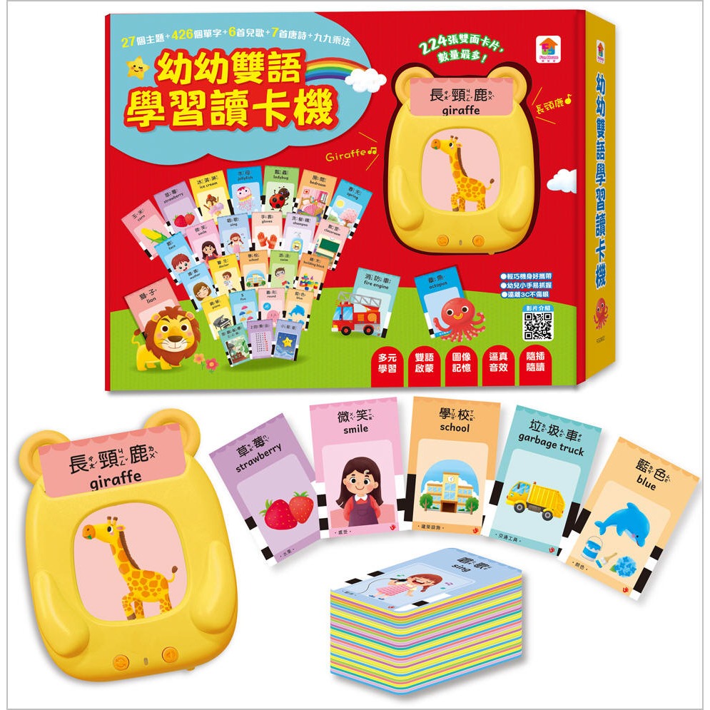 雙語讀卡機,全套含 主機x1、224張雙面圖卡、吊繩x1、充電線x1,紙盒裝(尺寸約 29.5x23.2x4.8 cm),適合年齡:3歲以上
