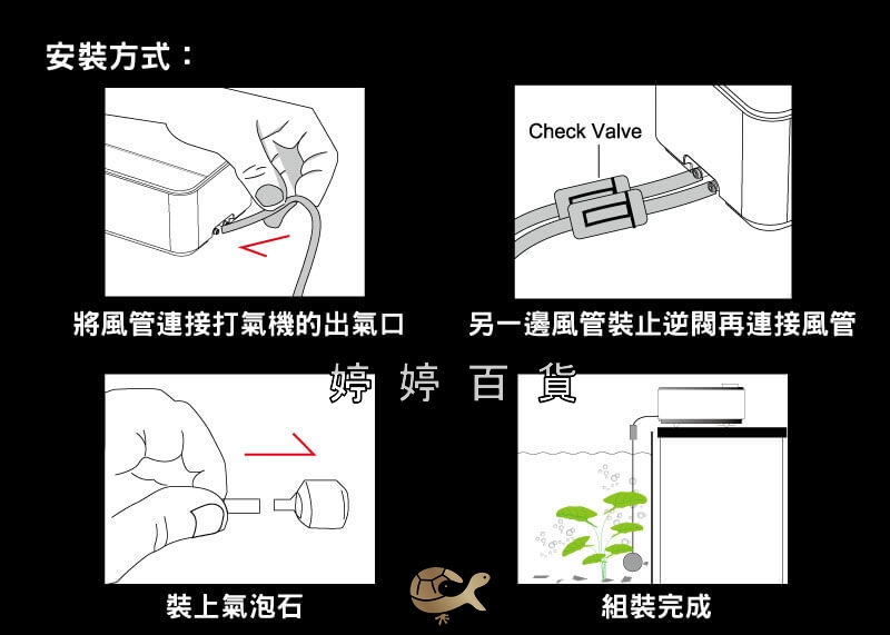 1.將打氣機的出氣口連接風管→另一邊風管裝上止逆閥→再連接風管後→裝上氣泡石。