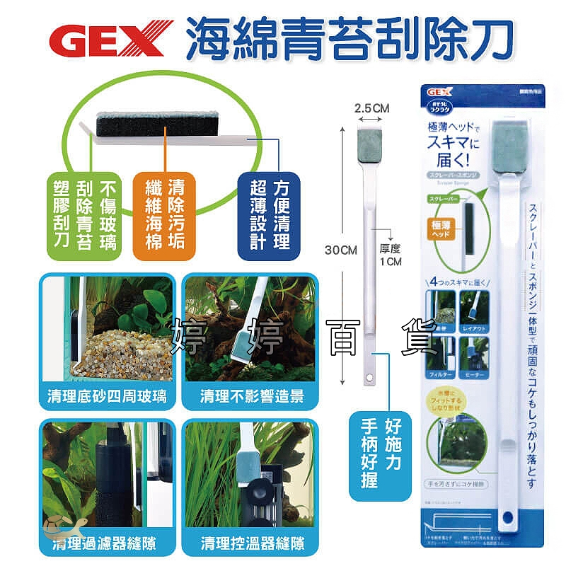 ●超薄海綿刮刀適合清理底砂四周玻璃、過濾器、加溫器和魚缸之間的縫隙,不用擔心破壞魚缸中的造景。