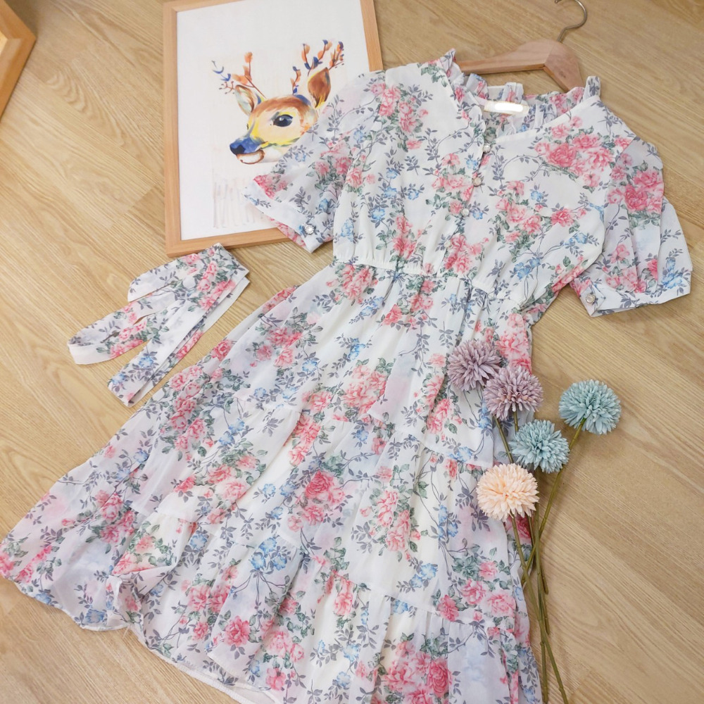 古典碎花 短洋裝 杏色 [Q06]