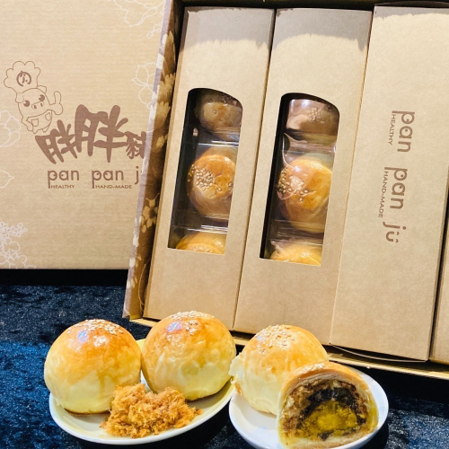 ▶被客人說我們的肉鬆蛋黃酥太大顆,可以做小顆一點嗎!?小豬用的可以真材實料呢,裡面整顆鹹蛋黃加滿滿的蔬果肉鬆,內容量足足有70克,勝過市面上一般35公克,2倍量當然是要包好包滿。為了滿足顧客的需求,在不影響品質上的狀況下真的是難以更改,因為這是小豬精心研究的最佳黃金比例。