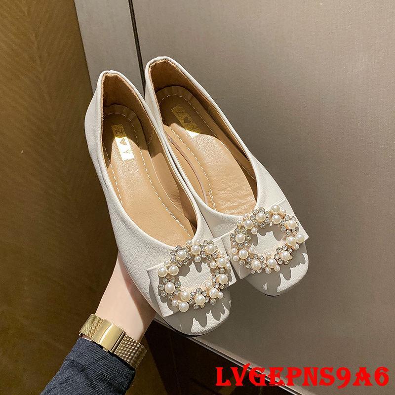 金蟬生活百貨館-單鞋女新款2022平底上班鞋淺口方頭時尚珍珠瓢鞋春季軟皮工作女鞋