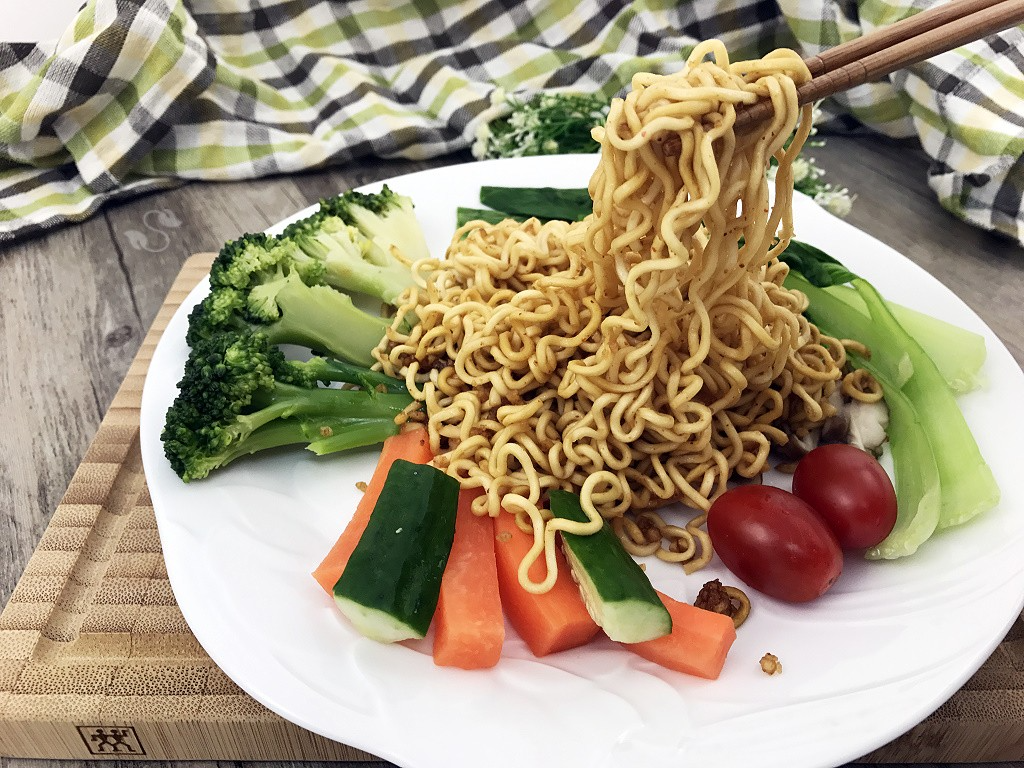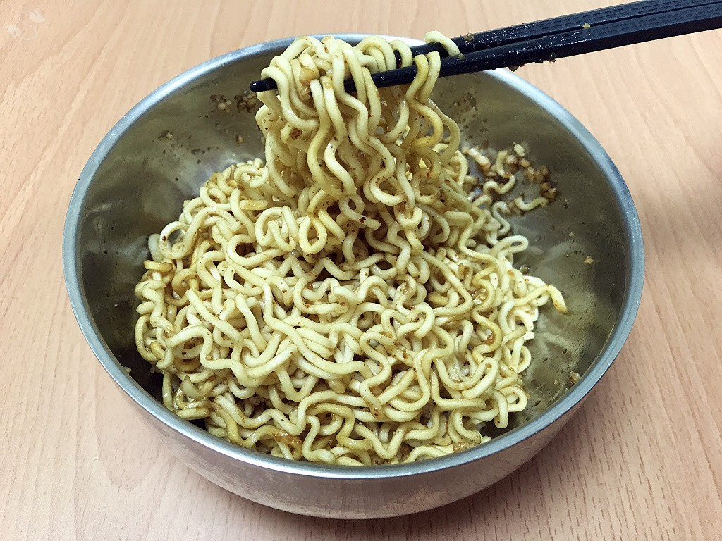 - 水煮開後,放入麵條,用中火煮足3分鐘後,再用篩子撈起麵條,瀝乾水分後將倒入之麵條與調味醬料在碗內充分攪拌均勻