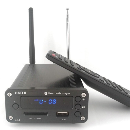 全新升級版L8解碼功放已到貨,數位管顯示升級成白色和藍色,高品質黑色遙控器,功放晶元升級成ST(意法半導體)TDA7498E,主板全新模塊化設計,引領潮流。解碼晶元升級,採用本店獨家定製的單晶元解碼,集解碼和藍牙功能於一芯,藍牙最新5.0版本,支持SD卡,U盤,移動硬盤播放APE,FLAC,WAV(DTS),MP3,WMA,RCA蓮花音頻輸入,3.5MM耳機音頻輸出,寬電源直流12-32V供電。推薦直流24V,電流3-5A。大部分筆記本電腦上的電源都可以用,註意電源插頭必須是5.5/2.5mm規格。在標準直流24V下,功放可推阻抗4歐姆100W,8歐50W的各類書架音箱。解碼目前只支持常規的(包括多聲道DTS編碼的WAV)16位, 44.1 kHz採樣率,1411.kb/s碼率。超出機器播放能力的歌推薦把歌復制到手機里用藍牙方式播放。新L8多功能支持SD卡、U盤、移動硬盤、PC聲卡、AUX音頻輸入、藍牙、FM收音。新L8不僅在硬體上巨大提升,軟體上也做了很多優化:1, 增加對移動硬盤播放的支持,親測2TB的移動硬盤播放,全網唯一,註意SD卡,U盤,硬盤需格式化成FAT32或者exFAT格式。2,可以和電腦USB連接成為解碼器,3,支持文件夾播放,下一文件夾和上一文件夾遙控器按鍵控制。4,播放U盤SD卡時支持A-B復播,此功能非常好用,對學習唱歌,學外語很有幫助。5,增加FM收音刪電台功能。信號不好的,不喜歡聽的,空白的電台可隨意刪除。