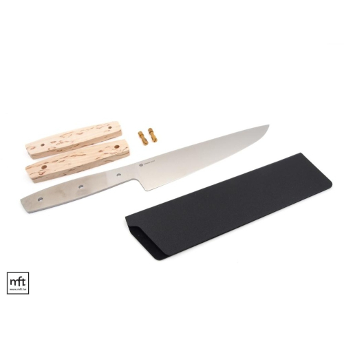 Chef 195主廚刀刀胚,刃型來自於日式牛刀(Gyuto),刃長19.5公分,刀尖細且尖,適合處理蔬菜,肉類等食材,握柄部位稍往上抬的設計,可避免使用時手指碰觸到桌面。採用12C27不鏽鋼鋼材,Full Tang全刀根,刀柄位置有3個Pin孔,Pin孔直徑為4.6mm。