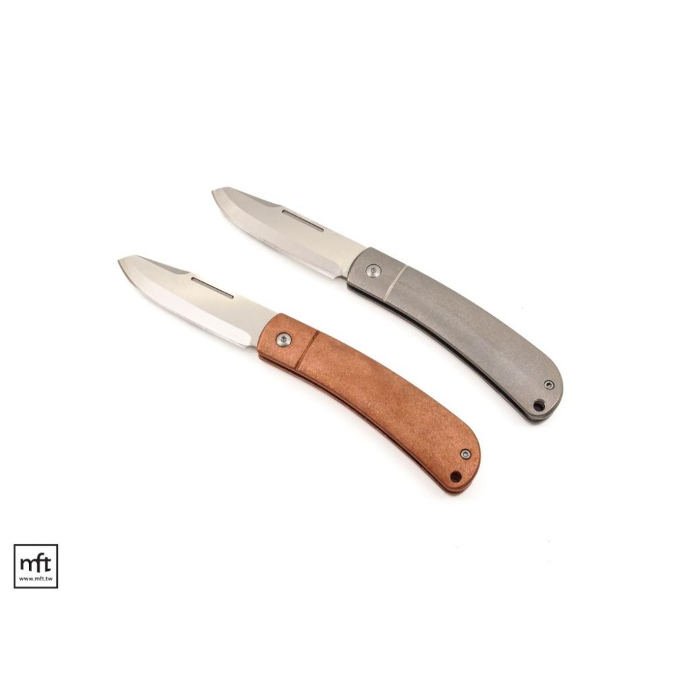 刀刃為Wharncliffe羊蹄刃型,握柄有兩個材質,鈦(Titanium)與紅銅(Copper),握柄前端有一道痕切,分隔出一段視覺上的Bolster區域(傳統小刀Bolster的部位經常是不同材質),尾端有一個尾繩孔,整體構造相當簡單,造型也很俐落。