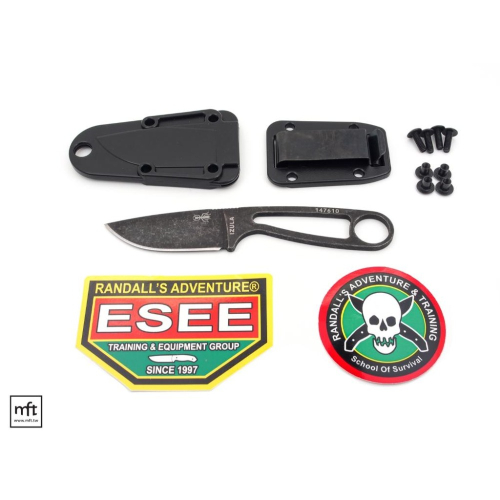 1095碳鋼版的ESEE Izula有多種顏色,本款為Black Oxide黑石洗版(黑色石洗刃面,Black Oxide處理簡單說就是先讓表面故意氧化,產生的黑色表面,再經過石洗處理,表面不會反光),刃長7公分,Drop Point刃形,平磨刃角,隨附一個塑膠刀鞘,以及背夾片套件。