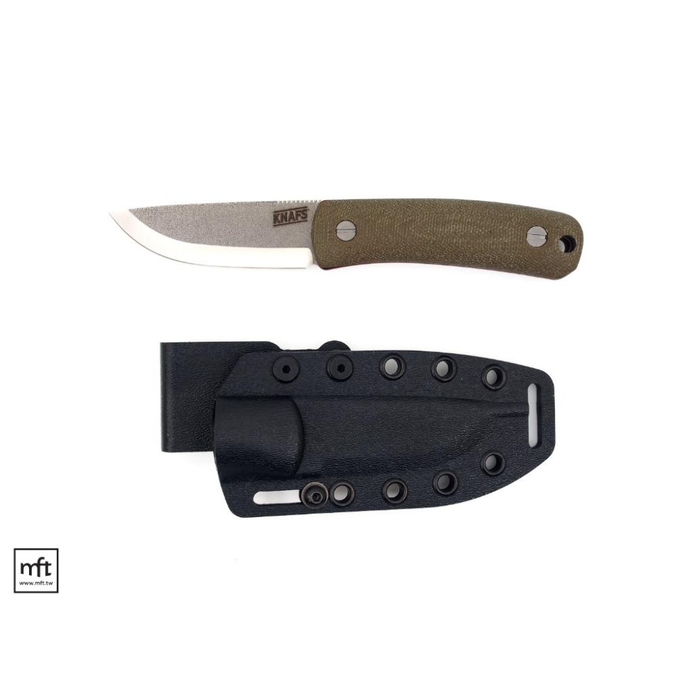 Drop Point刃型,Scandi刃角,刃長約7.5公分,握柄為Micarta材質,尾端有一個繩孔可以自行繫上掛繩,另外隨附一個Kydex刀鞘。
