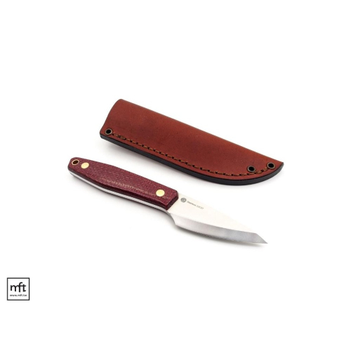 成刀版的握柄有兩種材質:Plum Micarta酒紅色Micarta與Curly Birch樺木柄。隨附一個西式皮刀鞘。