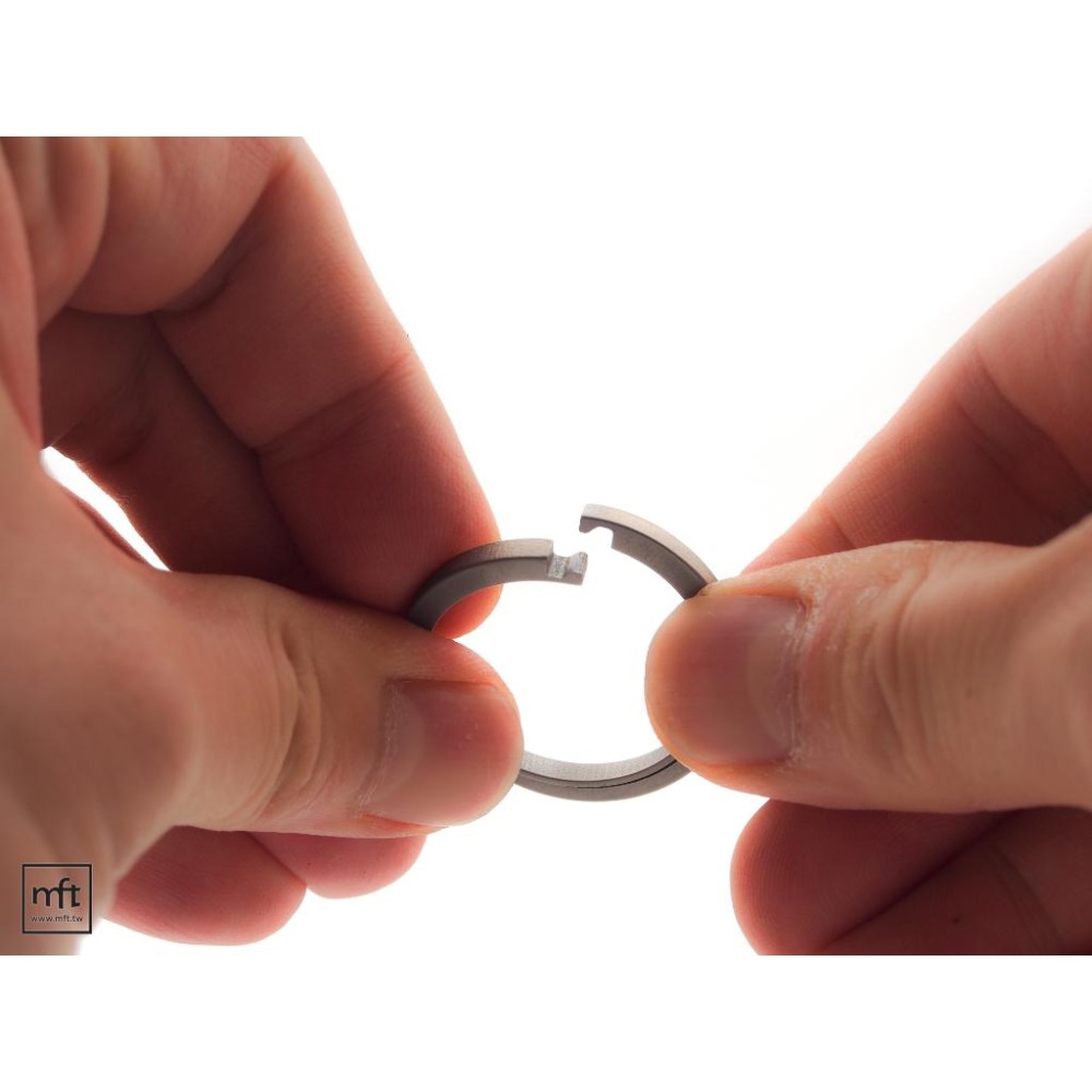 這組鈦合金材質製成的鑰匙圈環,一組有3個,外徑分別為32mm,26mm,20mm,是由一塊完整的鈦版件,利用EDM線切割技術製造,在鑰匙圈環上切割出很細的線,讓原本堅硬的材質可以有彈性,使用的時候側向左右施力即可打開,快速省力,不需像是傳統鑰匙圈環要以指甲撐開,適合需要快速裝上與拿下物品時的情境使用。