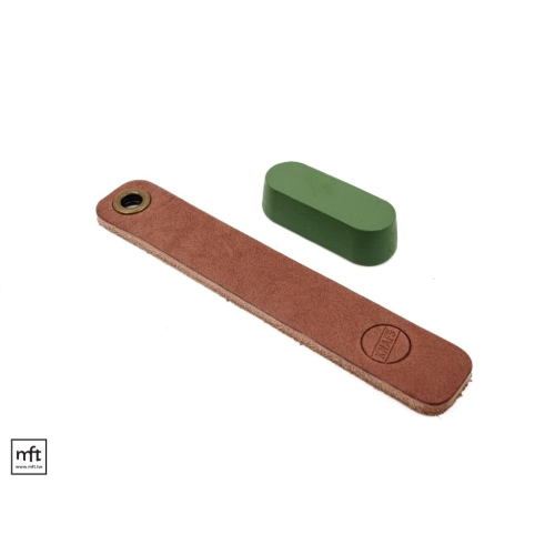 KNAFS這款皮革磨刀板,主要是設計給尺寸較小的刀子使用,例如小頸刀與折刀,皮面尺寸大約15 x 2.5公分,方便攜帶,尺寸雖小,但採用相當厚的皮革為材料,皮面的一端安裝一個氣眼孔,可用來掛扣。另外附一顆綠色研磨劑(Strop Compound)。