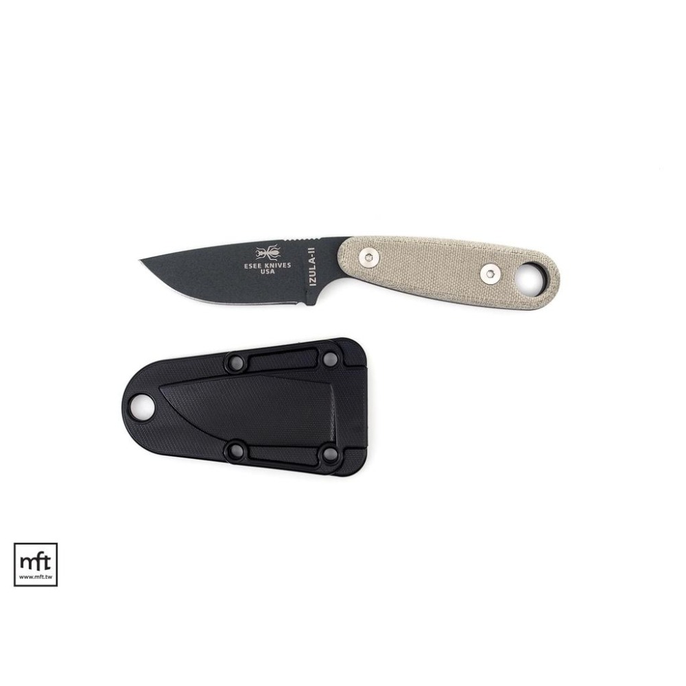 本款為ESEE Izula II Tactical,握柄片為Micarta材質,刀刃表面Gunsmoke(深鐵灰色) Powder Coat塗層。