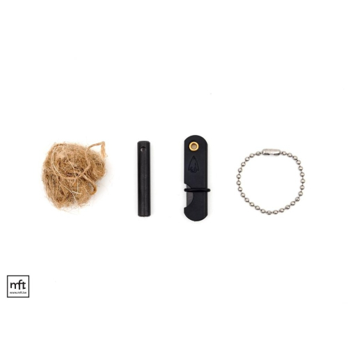 整組的Wazoo Fire Starter Knife Keychain另外附一條珠鏈將兩者串連,方便攜帶,還附上一小團麻繩纖維,可以用來當做火種。