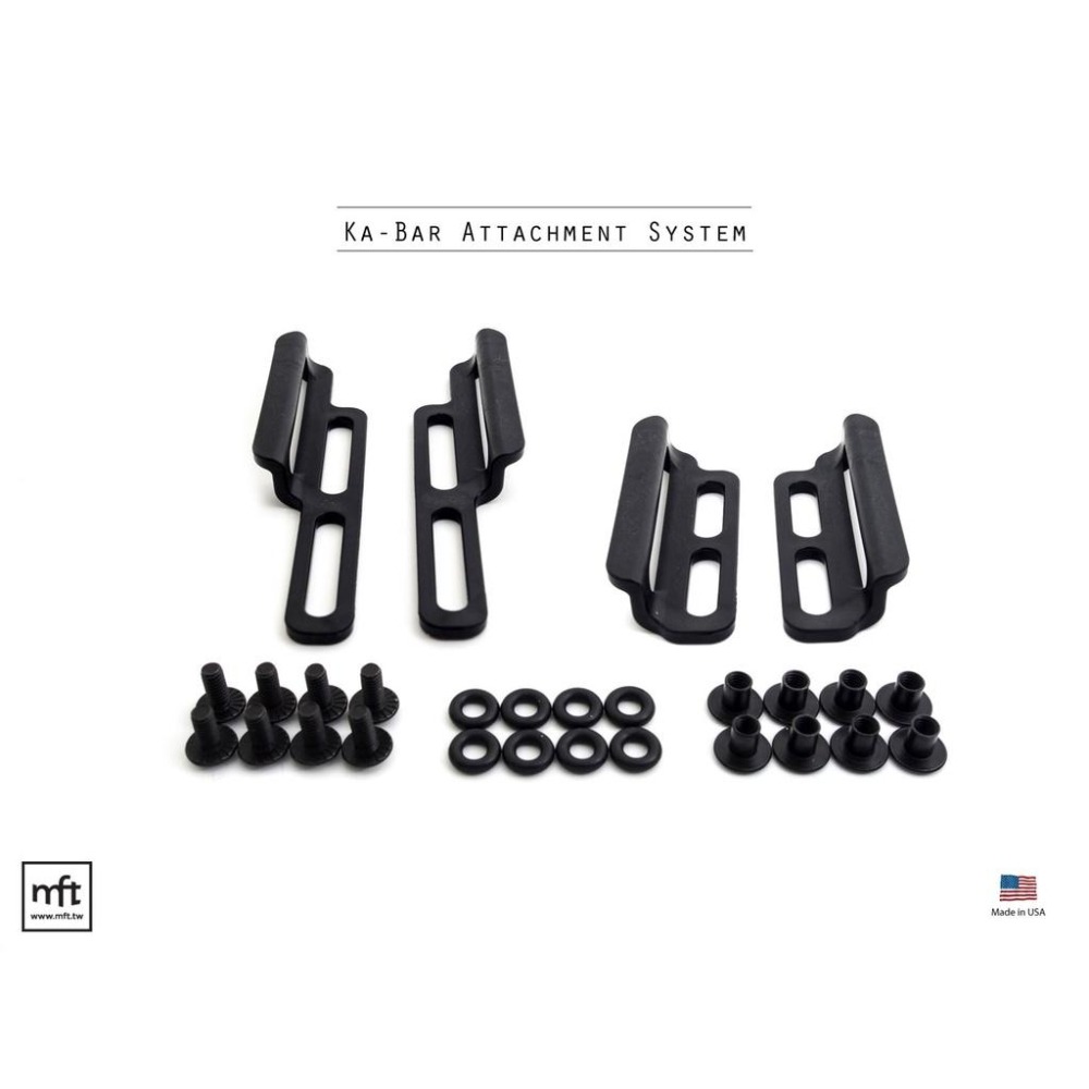 Ka-Bar Attachment System包含兩組扣環,長的兩個,短的兩個,以及螺絲和O環墊片組。可以橫向或直向安裝在Kydex刀鞘上,長形的螺絲孔位可以自由調整位置,以搭配不同Kydex刀鞘,扣環的尺寸請參考圖2尺寸標示。