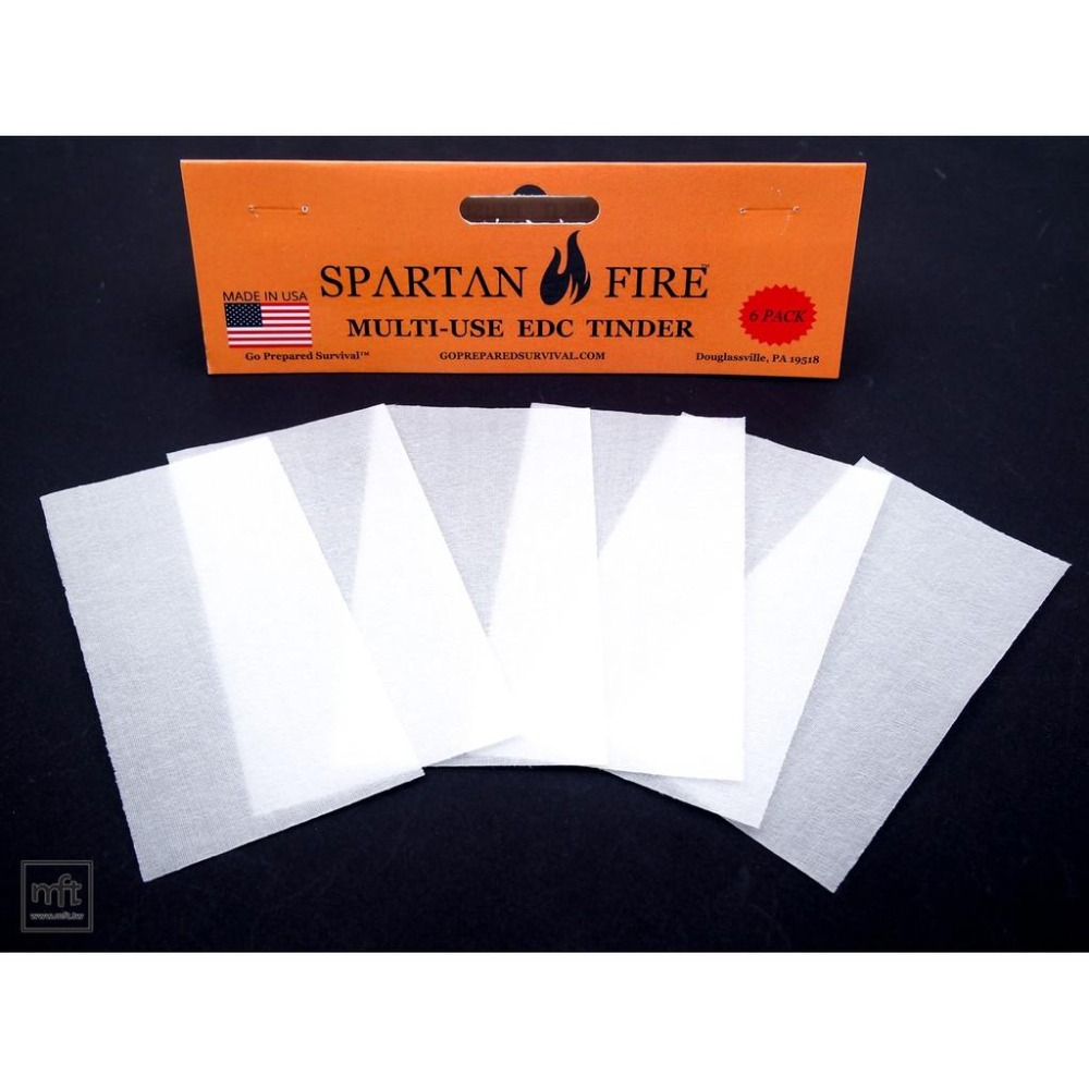 Spartan Fire Tinder是片狀的火種,主要是以棉布和特殊的蠟所構成,一片的大小大約是10x5公分(XL加長版為20x5公分),一包有6片。可以任意摺疊或是裁切成需要的大小使用,方便攜帶。其中的蠟成分需要125度才會溶解,因此一般狀況將它放在皮包或是求生包裡面,不怕它會因為溫度而融掉,而且除了當做火種外,還有以下功能和特點