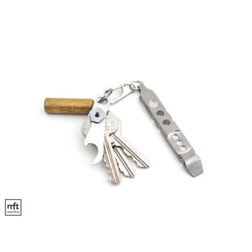 Ti-Pry鑰匙圈版是由鈦合金一體切削製成,結構強壯,重量16克,可以用來開油漆桶類的蓋子,撬拔物體(例如:拔釘書針),刮除貼紙,前端可用來開紙箱,或是當做一字起子使用,背部尾端另有開瓶器的設計。