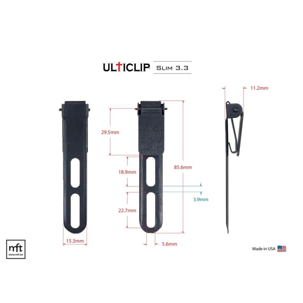 UltiClip的特色是:隱匿性高,夾持的力道非常強(超過一般市面上夾具的10倍以上的力道),目前共有5種不同尺寸的UltiClip扣夾,可以運用在各種不同的尺寸的刀鞘或是槍套,幾乎可以說是目前市面上最強悍好用的夾具,如果你自己有製作設計Kydex刀鞘或是皮革刀鞘,UltiClip更是可以輔助你製作出非常實用的作品,UltiClip是高品質且好用的必備夾具,MFT絕贊推薦。