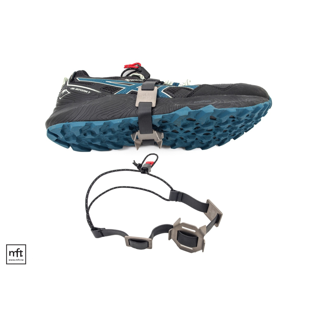 主要的結構為六角形片狀鈦金屬片,四邊突出尖角,穿戴的時候尖角需朝向地面,兩側各有一片鈦合金固定片,將固定片調整切齊鞋底的邊緣,套至鞋底中央後,把鬆緊繩拉緊即可,可適用絕大多數的鞋子,套上後即可使用。