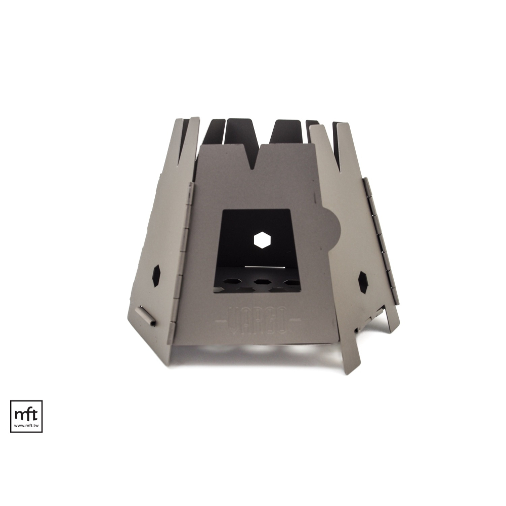 Hexagon Wood Stove是可摺疊收納的柴火爐,底部為六角型,每邊個有一面,折起後環繞底部,即構成錐狀六角結構。前方的門可以打開,方便置入木材,底部有開洞,讓灰燼掉落。 一體式的結構,不會有零件遺失的困擾。