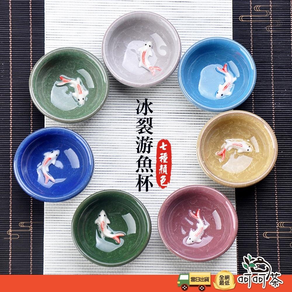 【呵呵茶】台灣現貨 茶具 茶杯 冰裂游魚杯 魚中杯 冰裂游魚杯 陶瓷 鯉魚茶杯 泡茶賞魚 茶具 冰裂杯 鯉魚杯 泡茶杯