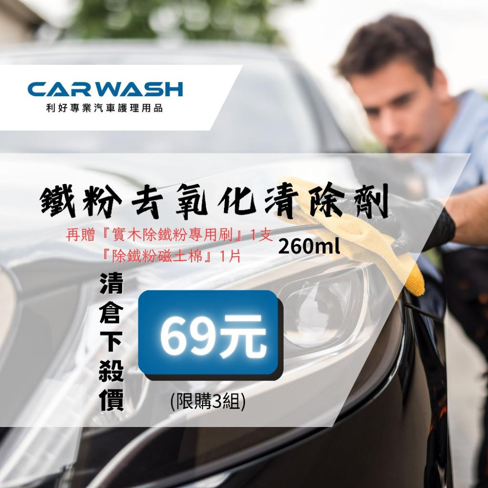 🔥清倉促銷,超狂贈禮回饋,特價只要 69 元 (因特價及贈送活動,故單筆訂單限購3組) 再加贈『實木除鐵粉專用刷』1支及『除鐵粉磁土棉』1片 https://s-cf-tw.shopeesz.com/file/tw-11134208-23030-2chve6rsayov68 https://s-cf-tw.shopeesz.com/file/tw-11134208-23030-6ns7glvtayovf8 CARWASH 利好專業汽車護理用品 (本店為台灣獨家代理) ✨鐵粉去氧化清除劑✨(260ml) ✔️【產品說明】 推薦您使用CARWASH 利好專業汽車護理用品開發製作的鐵粉去氧化清除劑,它是一種高效清除鐵粉的產品。環境中鐵粉來自於工廠排放、車輛碟盤磨耗等原因飄散在空氣中,靜電作用使其附著在車輛板金或輪框上。如果不及時清除,鐵粉會發生氧化反應,形成黃褐色鐵鏽斑點,損害您車輛的美觀和保值性。 CARWASH 利好專業汽車護理用品開發製作的鐵粉去氧化清除劑可以與鐵粉發生化學反應,將鐵粉徹底清除,避免出現鐵鏽斑點現象。使用本產品後,您的車輛漆面和輪框會恢復原有的光澤和美觀。本產品簡單易用,只需將其噴灑在車輛板金或輪框上,等待一段時間後,清洗即可。 使用CARWASH 利好專業汽車護理用品開發製作的鐵粉去氧化清除劑,讓您的車輛始終保持美麗和健康! ✔️【使用方式】 將「鐵粉去氧化清除劑」搖勻後噴灑於欲施作部位,等待本產品與鐵粉發生化學變化而形成紫紅色液體時,建議可使用本店「除鐵粉專用磁土綿」或刷子輕微擦拭(刷)強化清潔效果後,再用清水沖洗乾淨。 ✔️【注意事項】 ⚠️輪框用實木除鐵粉專用刷加強清潔(車漆可省略此步驟) ⚠️使用於電鍍材質前,請先小規模進行測試後,再行使用。 ⚠️本產品與鐵粉發生反應,會有化學味道,故使用時請注意通風。 ⚠️使用時避免長時間停留在輪框或車漆上,且避免讓此產品於表面乾掉。 ✔️【常見問題】 🔎鐵粉的危害有哪些? 鐵粉危害的可怕之處,在於它無法像樹脂、鳥糞一樣在洗車當中清洗乾淨,而且鐵粉極為細小又極易氧化,所以非常容易卡進車漆、鋼圈裡。鐵粉不管在鋼圈或是車漆上,就是會不斷氧化生鏽並向下侵蝕。可分為三種層級去判斷、處理。 鐵粉剛在表面依附時,會形成小黑點,生鏽後會轉為紅褐色。這時用鐵粉藥水或磁土施作,可很快去除。 鏽入金油層後,鐵鏽破壞、染色金油層結構,原本光滑明亮車漆發生霧化現象,這時車漆變暗、白車發黃,藥水怎麼洗都洗不掉,只能請美容業者拋光去除被鏽斑污染的金油層。 鐵粉繼續往下銹入底漆層以下,輕微者影響外觀,有黑點、黃斑,嚴重就是破壞烤漆結構,車漆起皮、剝落。傷到底漆時,要恢復就只能整個花錢烤漆了。 對鋼圈傷害也是如此,初期表面鐵粉髒污→中期鏽出洞來,讓鋼圈坑坑疤疤不光亮→後期破壞鋼圈結構,層狀剝落。 🔎實木除鐵粉專用刷或除鐵粉磁土棉如何使用? 可使用洗車泡沫或鐵粉清除劑噴灑於車身或輪框後,使用除鐵粉磁土棉或刷子,稍微塗抹或刷洗,強化清潔效果,去除鐵粉(車漆去鐵粉可省略這步驟)。 🔎CARWASH 利好專業汽車護理用品是什麼公司? 成立於2020年台灣,致力採用尖端技術及原料推出全新產品,突破傳統洗車及打蠟之觀念。 目前本店為台灣獨家代理CARWASH 利好專業汽車護理用品