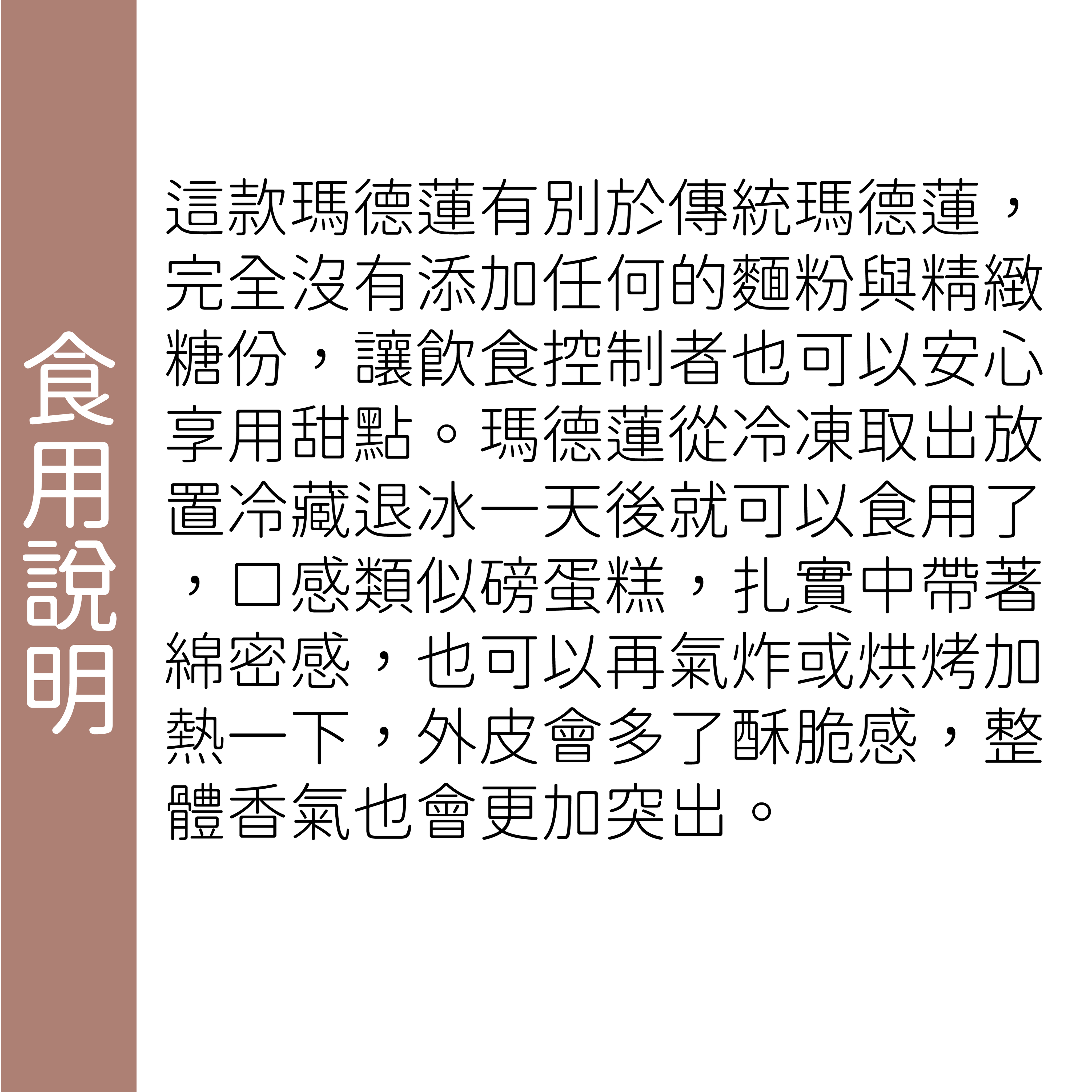 這款瑪德蓮蛋糕,為喜歡甜點又需要控制淨碳水攝取的您,提供更無負擔的甜點選擇。