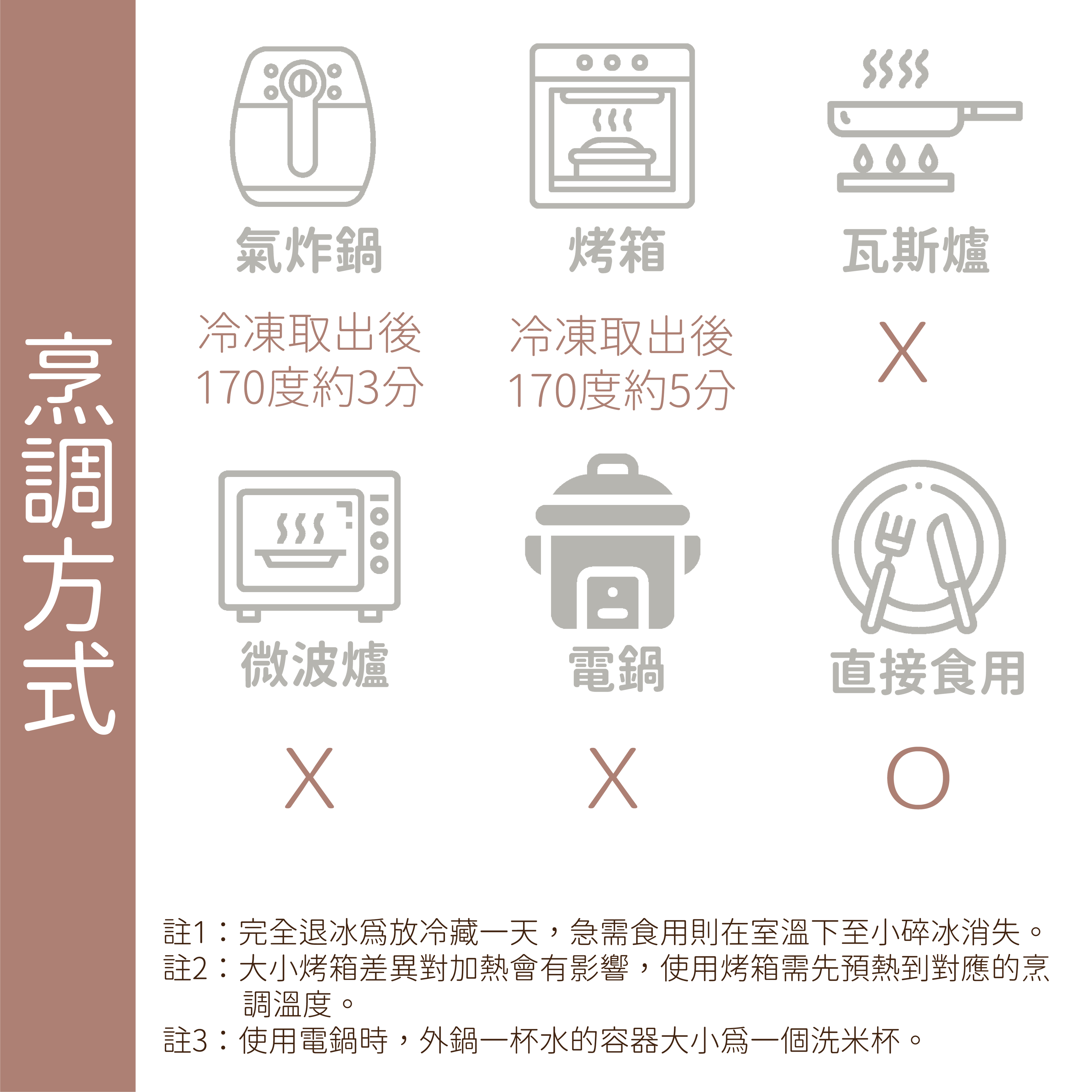 可使用氣炸鍋、烤箱加熱或直接食用。另外因為每日天氣與加熱電器差異,本圖僅供參考,實際加熱時間可依個人狀況做調整。