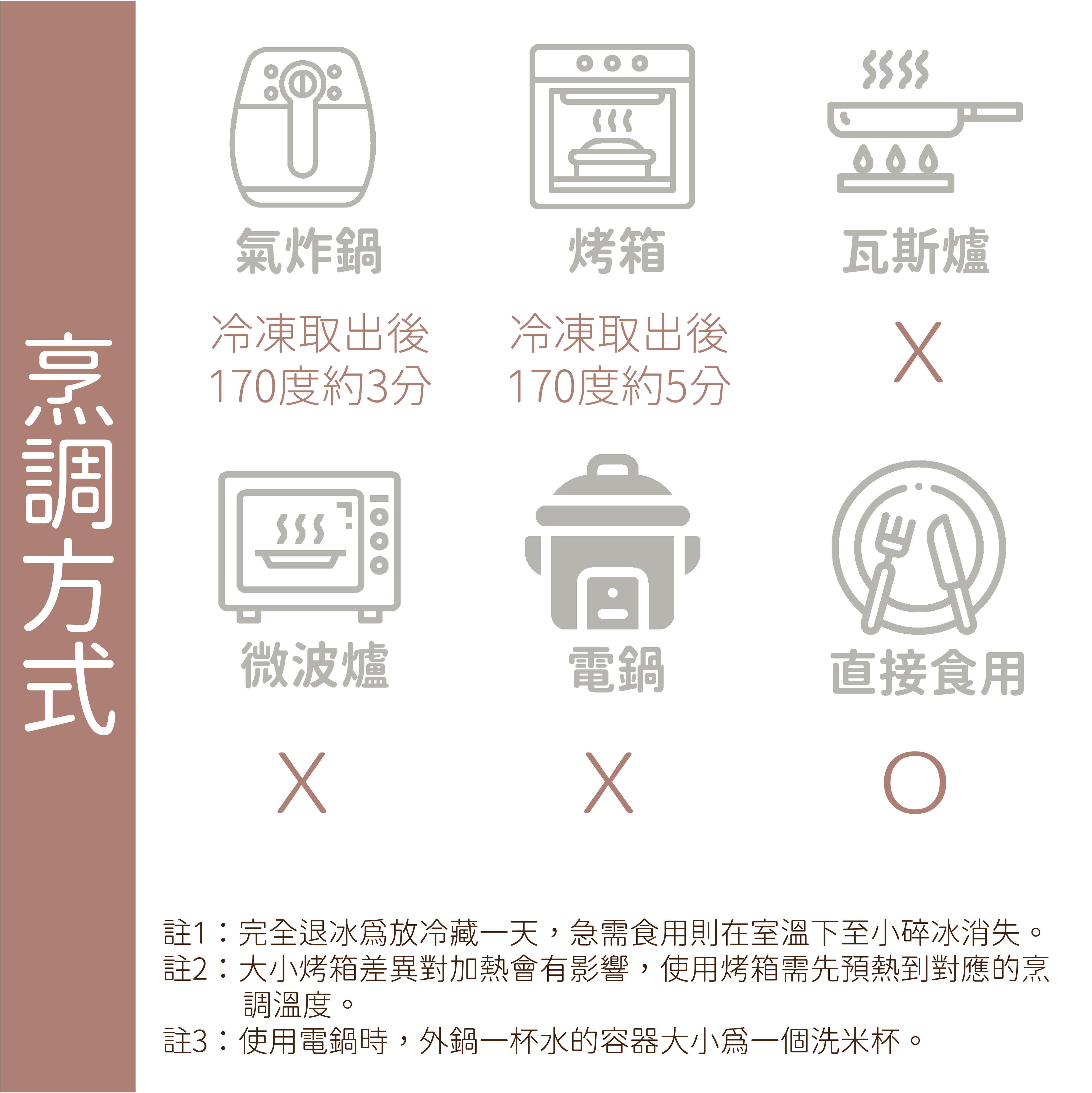 可使用氣炸鍋、烤箱加熱或直接食用。另外因為每日天氣與加熱電器差異,本圖僅供參考,實際加熱時間可依個人狀況做調整。