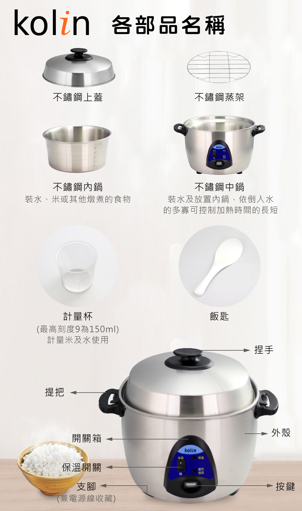 .配件:內鍋.飯匙.量杯.蒸架