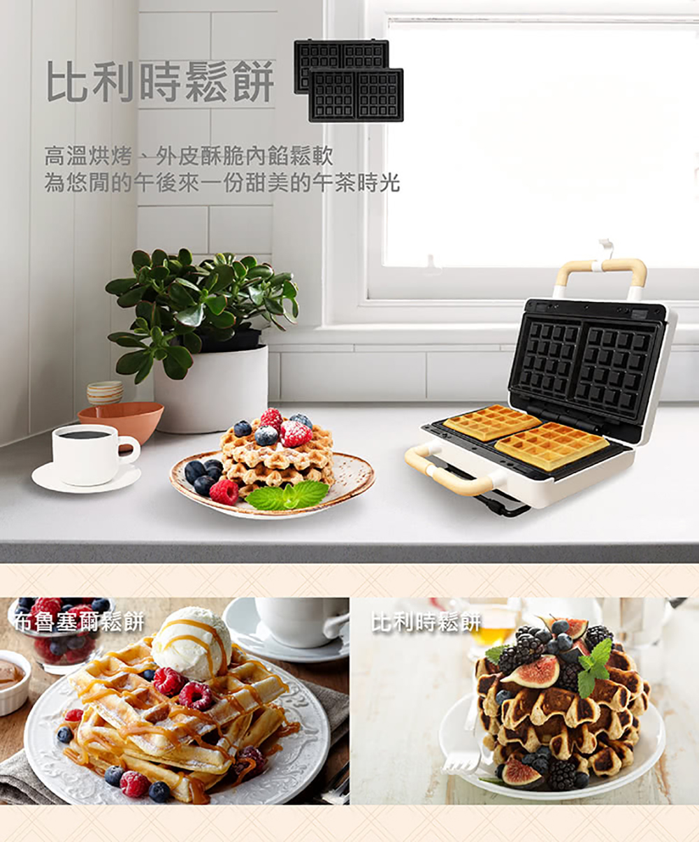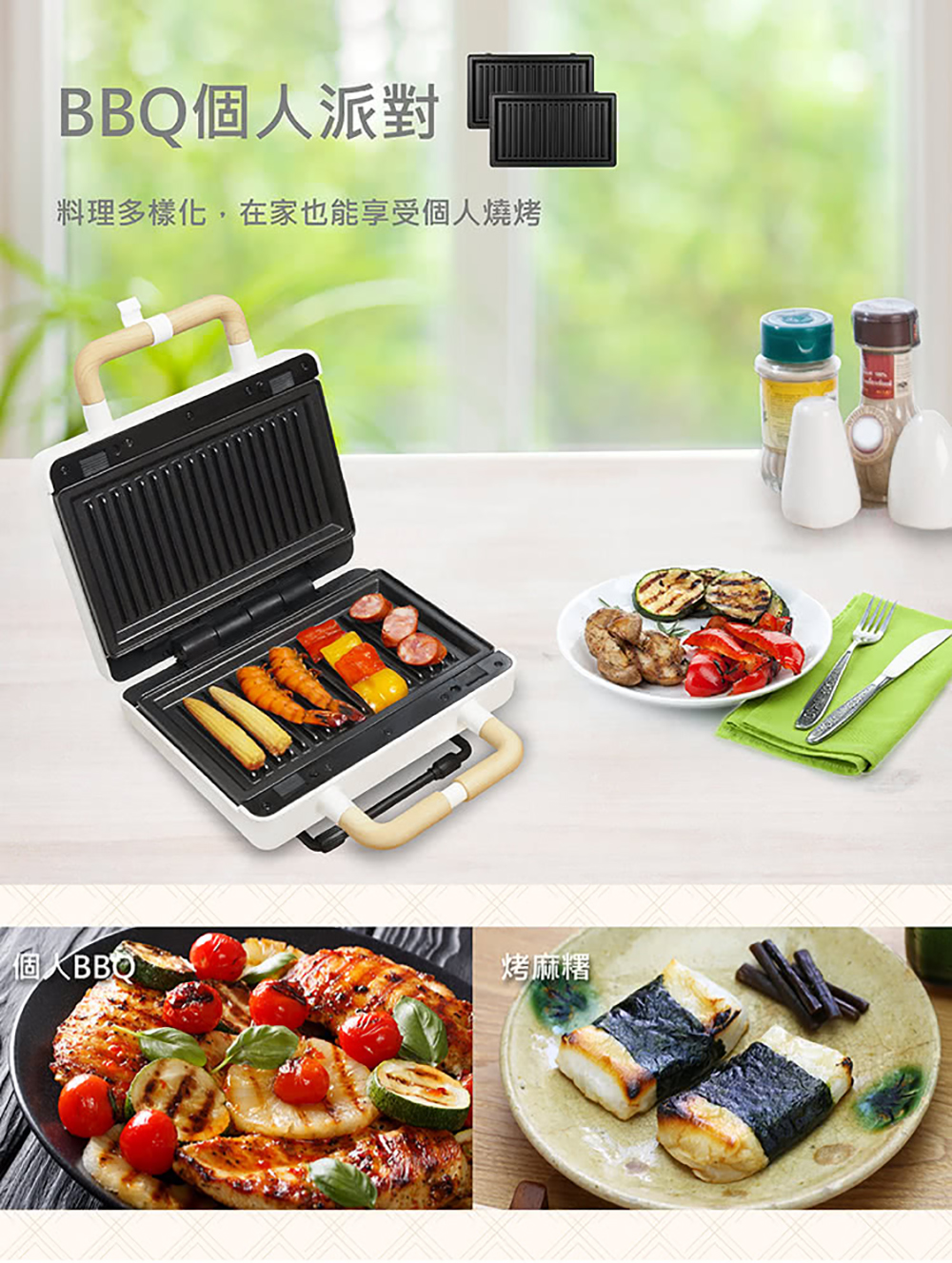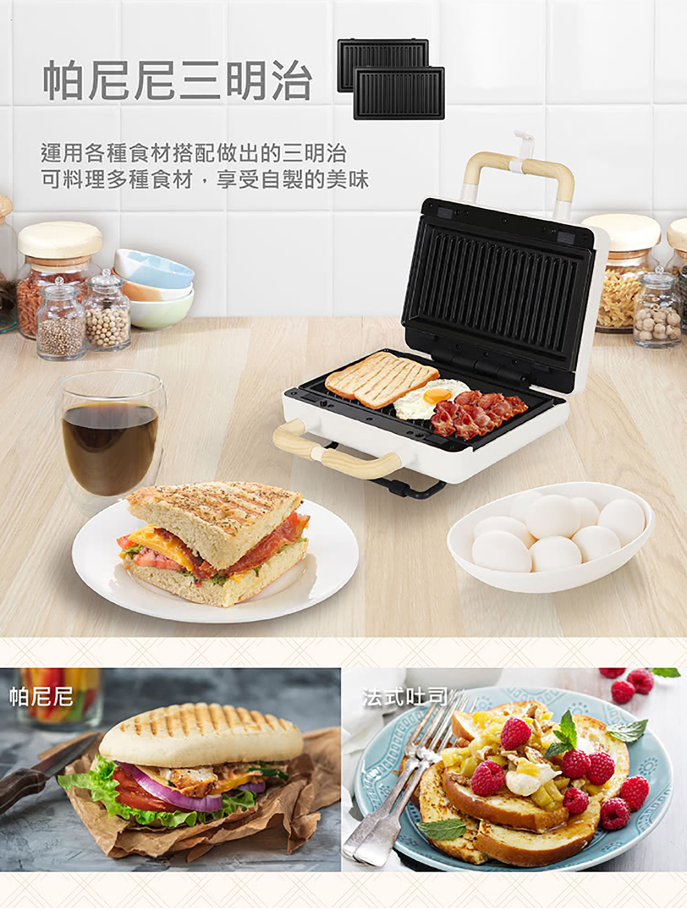 ◆ 配件:主機x1、三明治烤盤x2、鬆餅烤盤x2、說明書x1、保固書x1