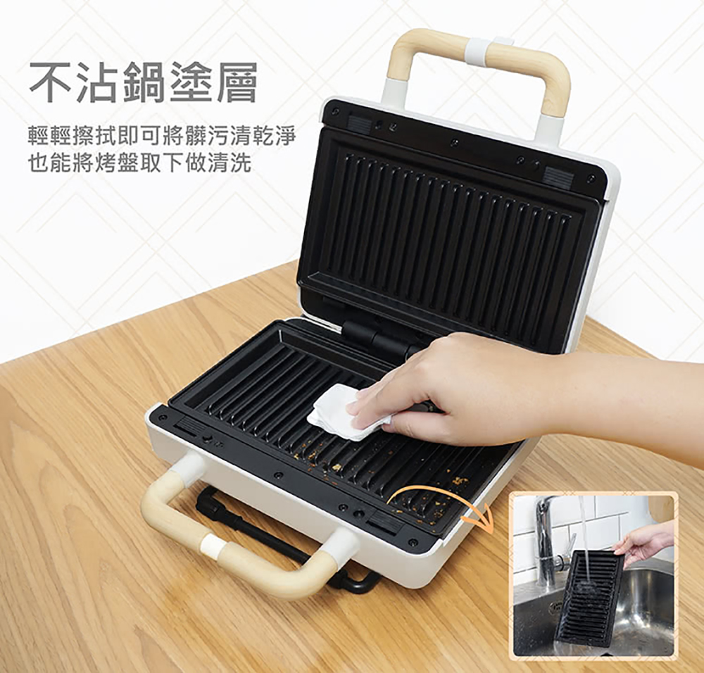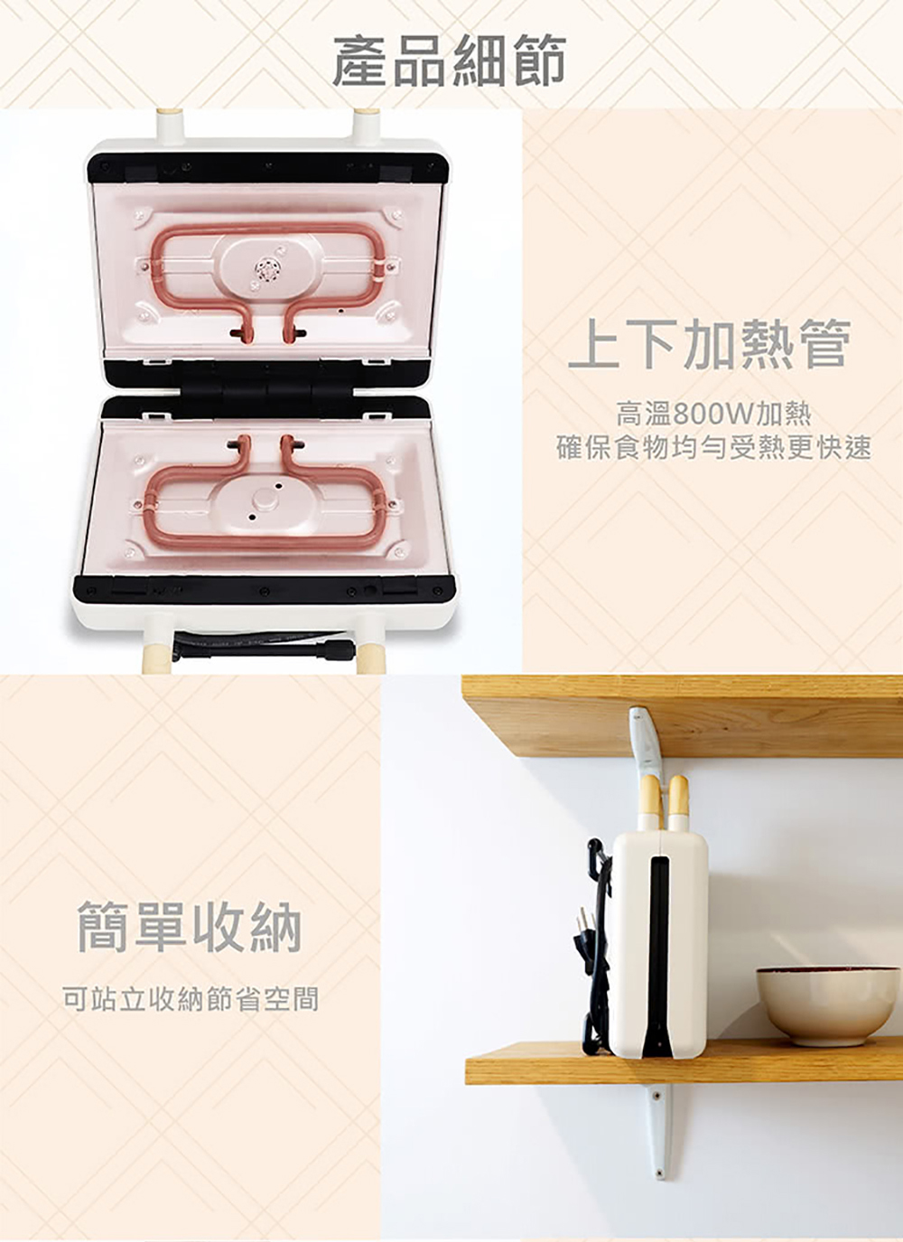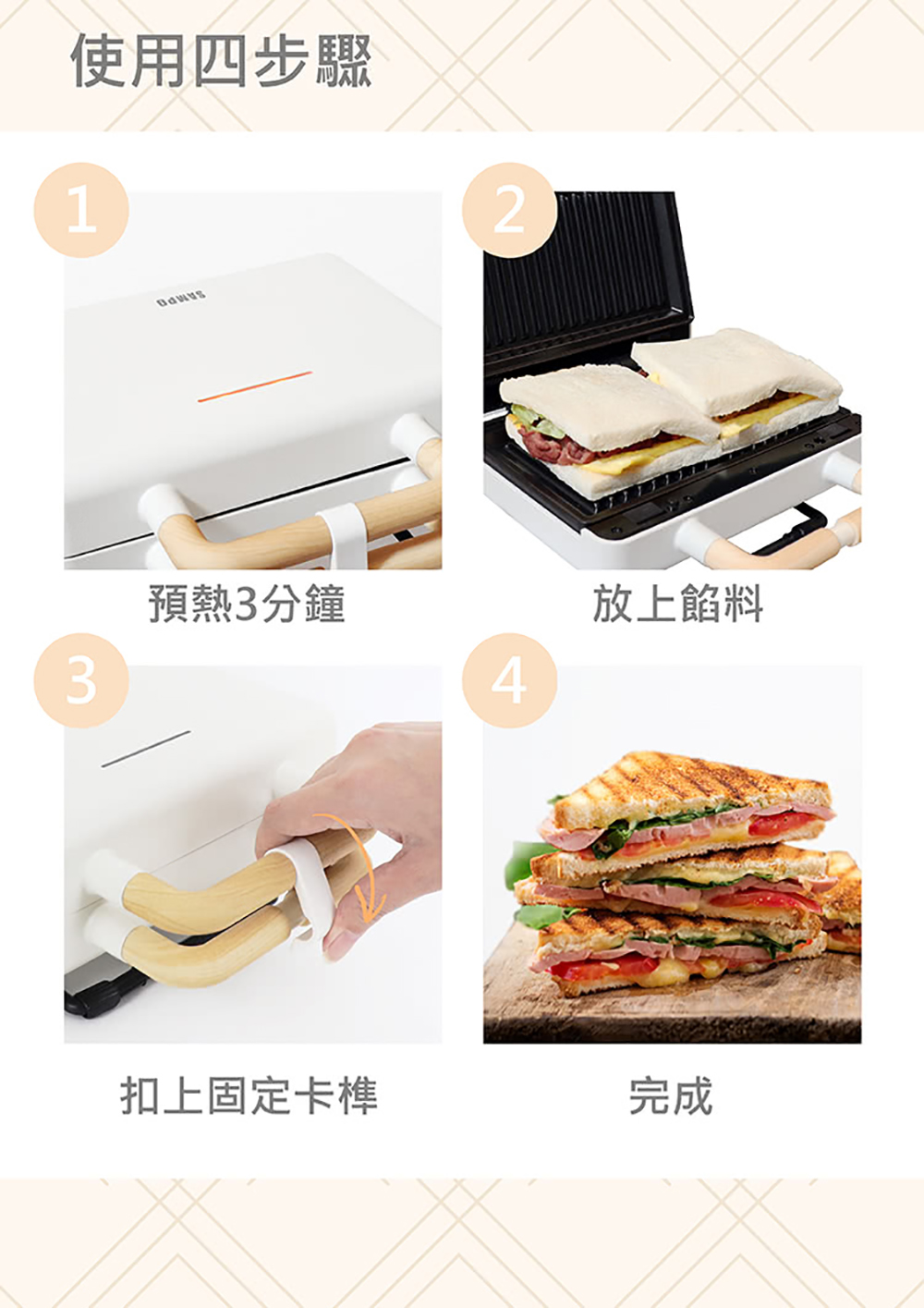 ◆ 配件:主機x1、三明治烤盤x2、鬆餅烤盤x2、說明書x1、保固書x1
