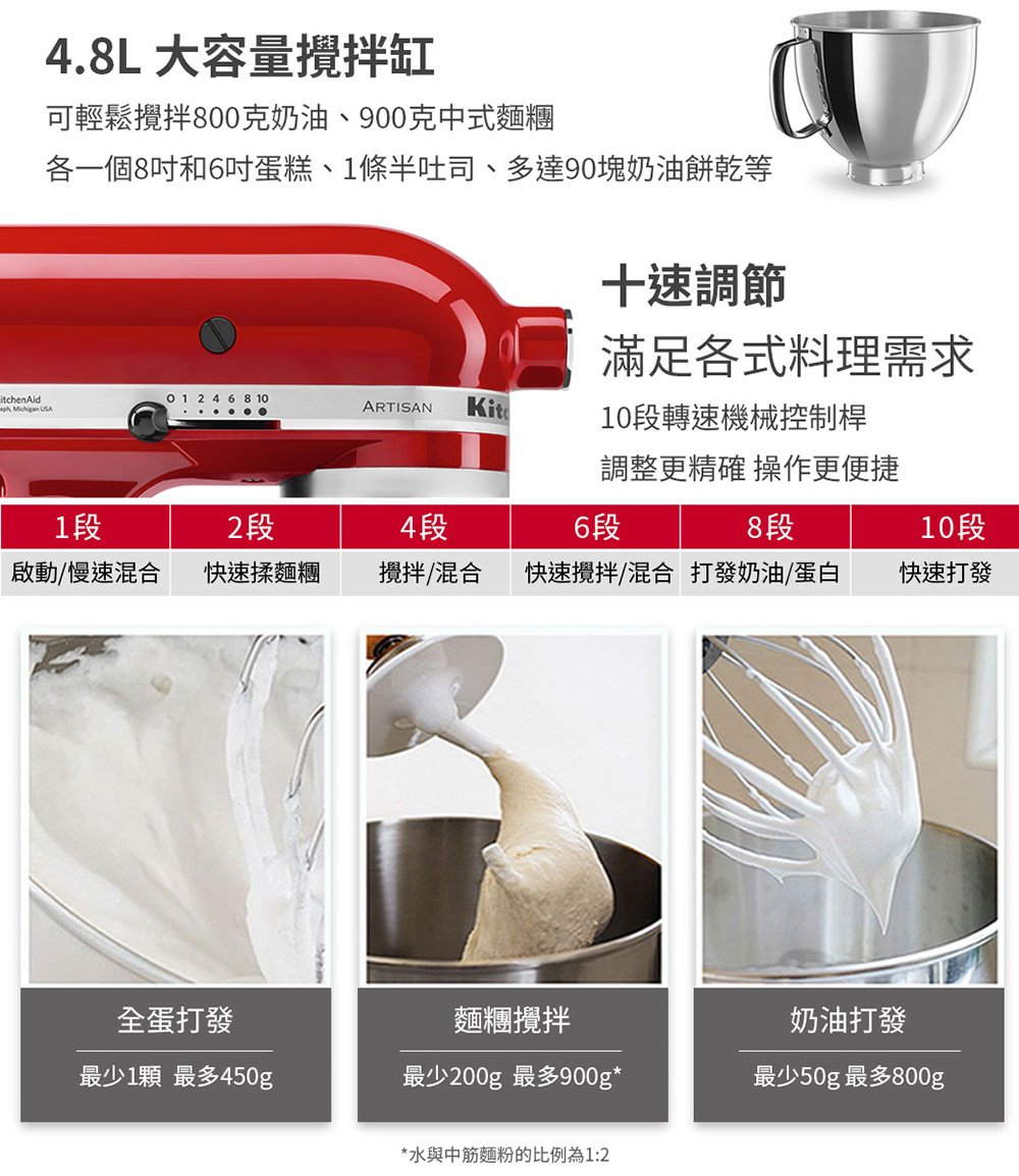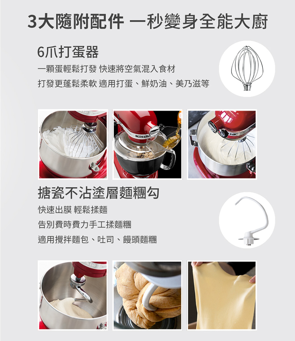 ■ 配件:4.8L不鏽鋼攪拌盆x1、打蛋器x1、平攪拌槳x1、麵糰鉤x1、透明碗罩x1