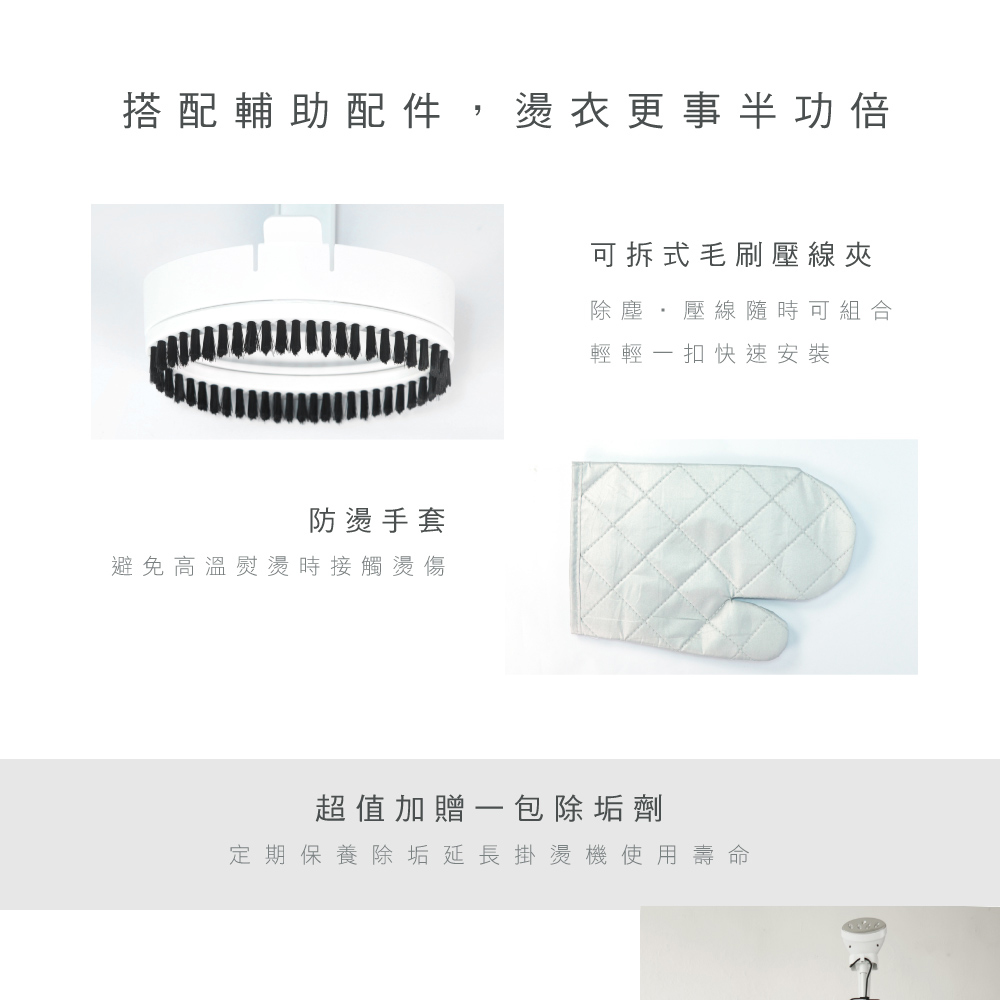 .配件:四段式伸縮桿架、毛刷壓線夾、掛勾支架、防燙手套、除垢劑