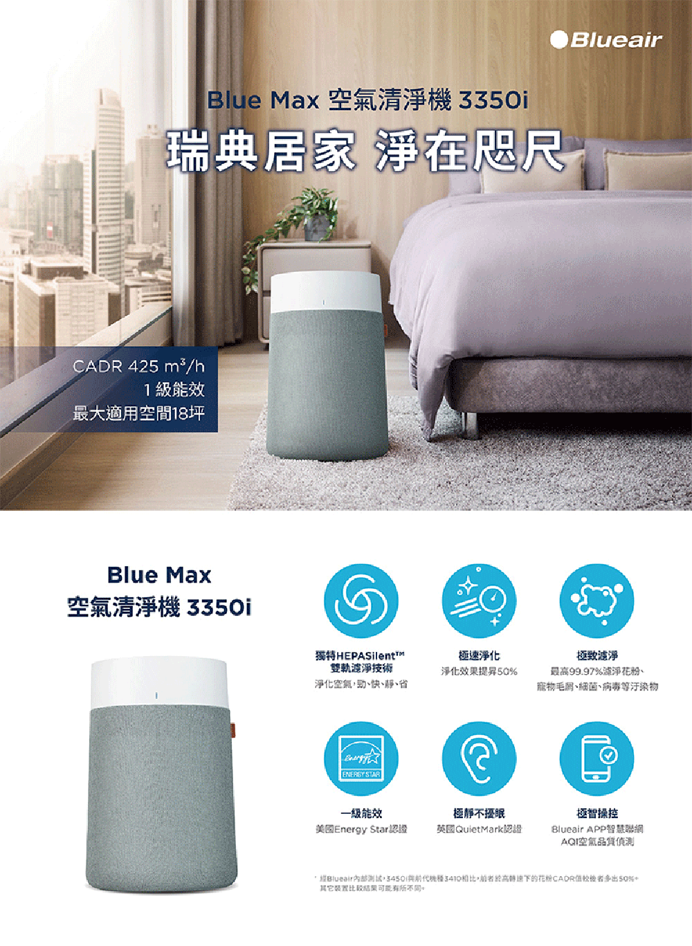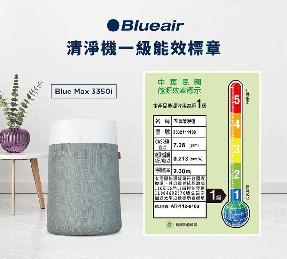 A5. CADR是Clean Air Delivery Rate的簡稱,即潔淨空氣輸出率。CADR值越高,代表空氣清淨機輸出的潔淨空氣量愈高,適用的坪數愈大;Blueair空氣清淨機依權威機構美國家用電器製造商協會AHAM定義,以每小時空氣交換4.8次的標準測量CADR值,並依此建議最佳使用坪數。在最高轉速下,BlueMax™ 3250i每隔大約 12.5 分鐘徹底淨化一次六坪之室內空氣,建議使用坪數10坪以內中型房間,如小孩房或起居室。