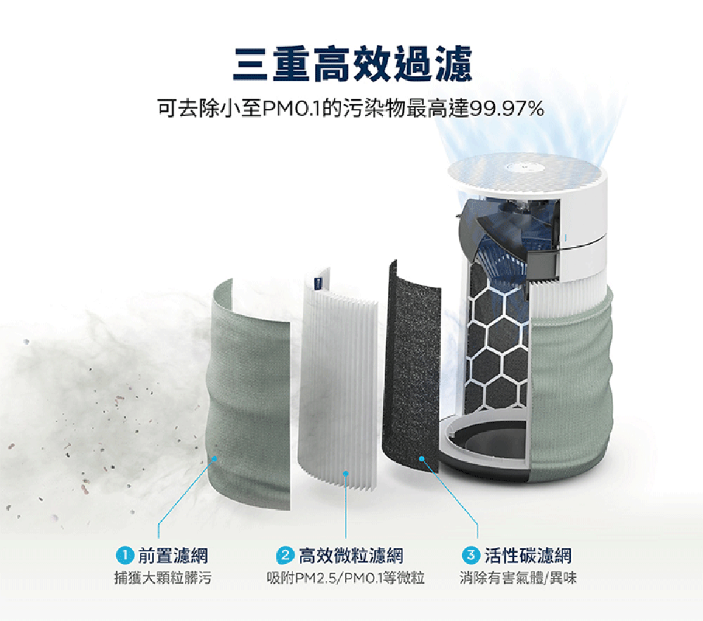 A2. 前置濾網可水洗進行清潔。清洗後需充分晾乾。主濾網需依濾網更換指示燈或Blueair APP應用程式提醒更換。請勿以任何方式如以吸塵器清潔或水洗等方式清潔主濾網,以免損壞濾網材料並降低性能。