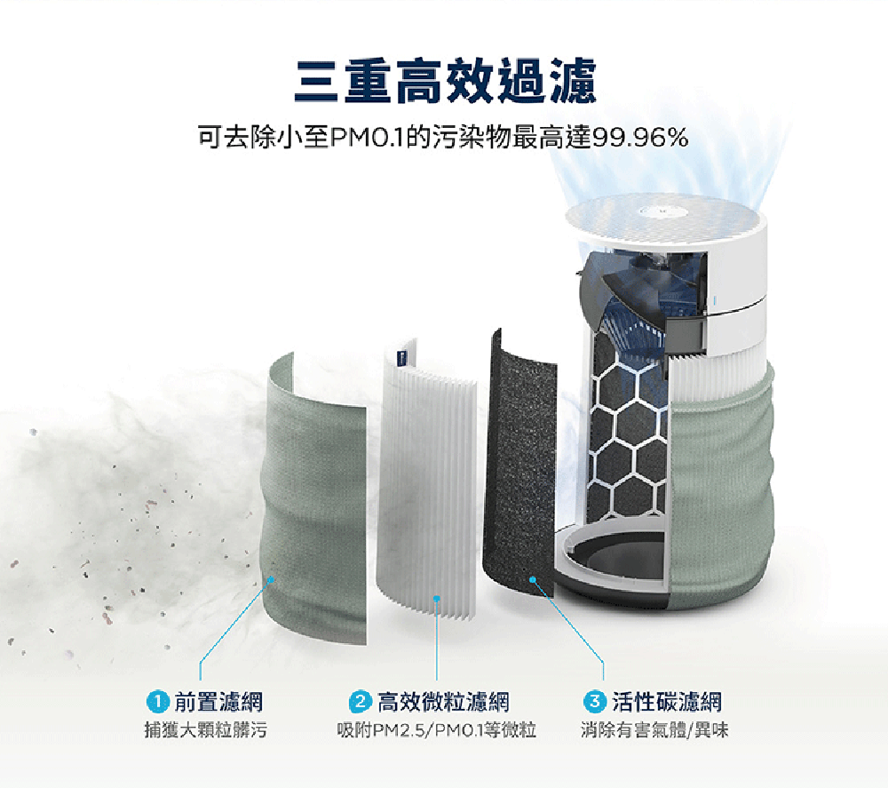 A2. 前置濾網(上下各一組)可水洗,建議每周清洗;微粒活性碳複合濾網不可清洗,請依濾網更換指示燈或Blueair APP應用程式提醒更換。