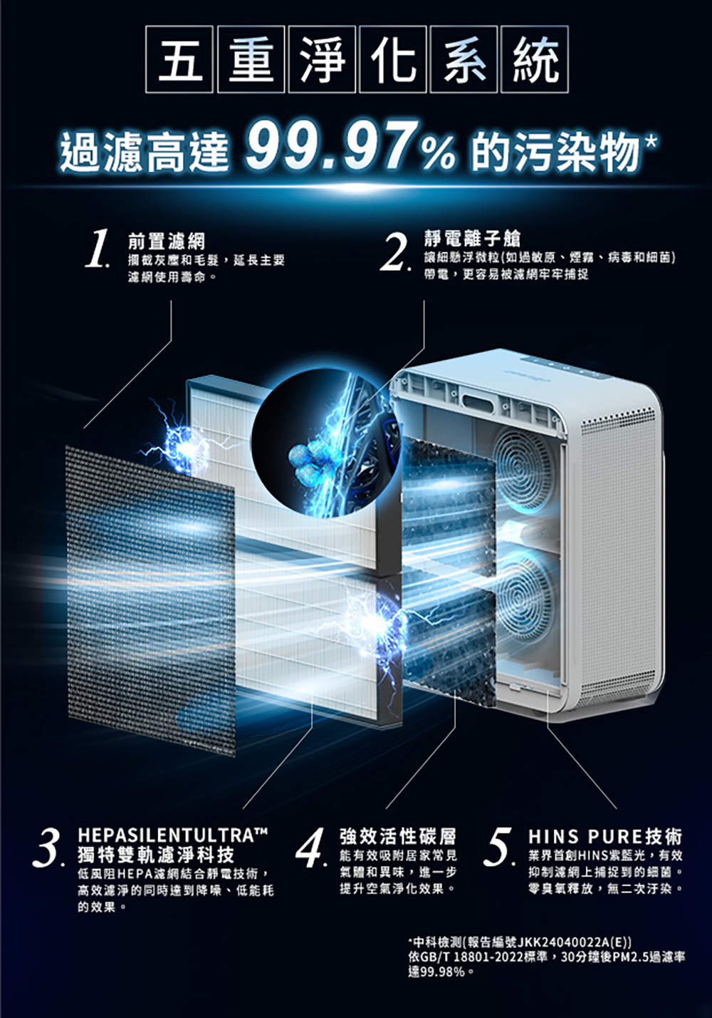 A5. 使用 HEPASilent 技術和 PhotonPure 技術。HEPASilent 技術通過靜電吸附和過濾來捕捉微小顆粒,而 HINSPure 技術則使用安全的光波長來降低濾網上捕捉到的細菌和病毒的活性。