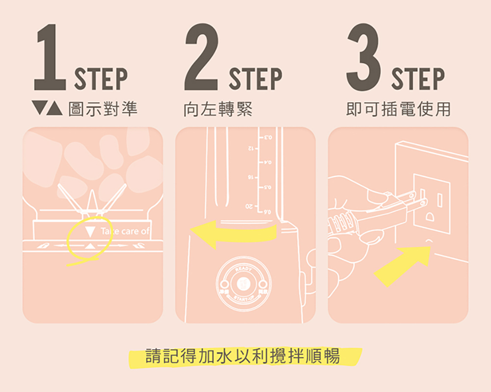 .配件:主機x1、、隨行杯x2、刀座x1、杯蓋x2、說明書x1、保固書x1