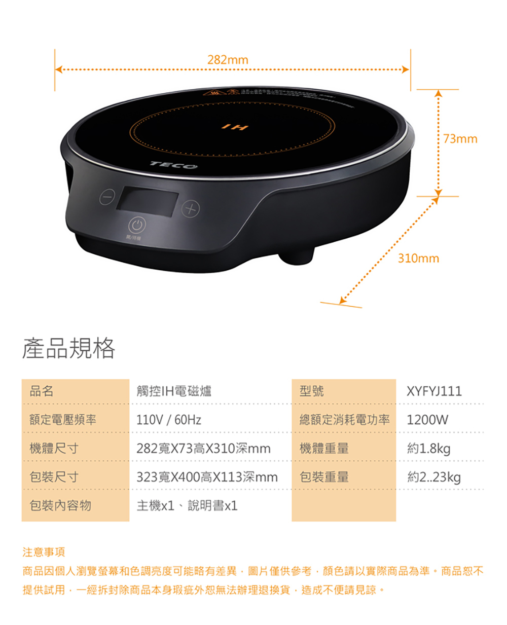 .商品名稱:東元觸控IH電磁爐XYFYJ111