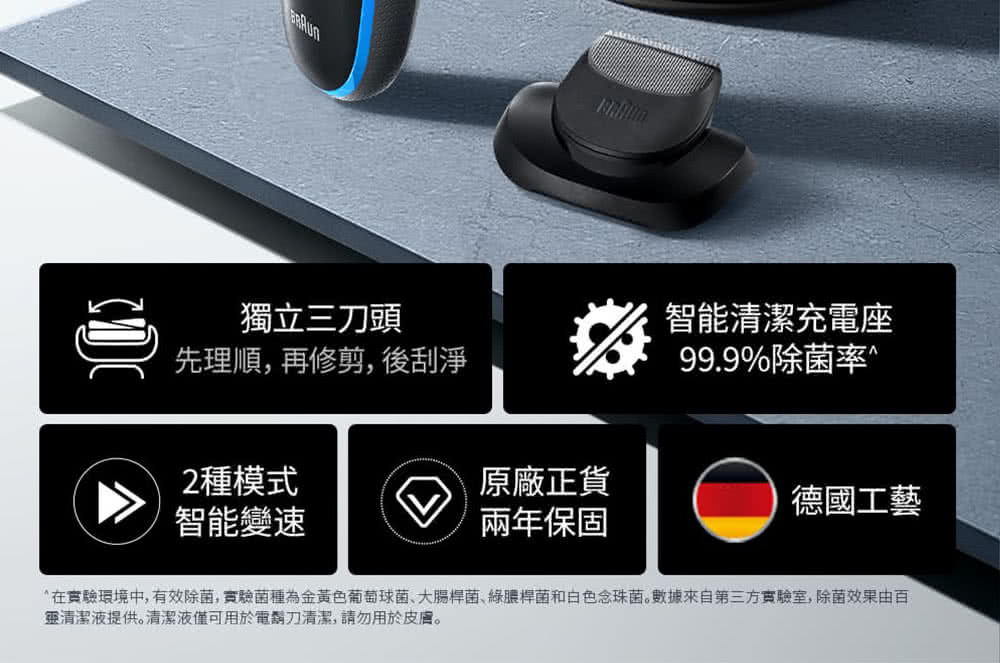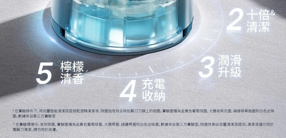 .配件:保證書/中文說明書/自動清潔充電系統/清洗液/清潔刷/電源插頭/刀頭保護蓋/鬢角刀配件/造型修容配件
