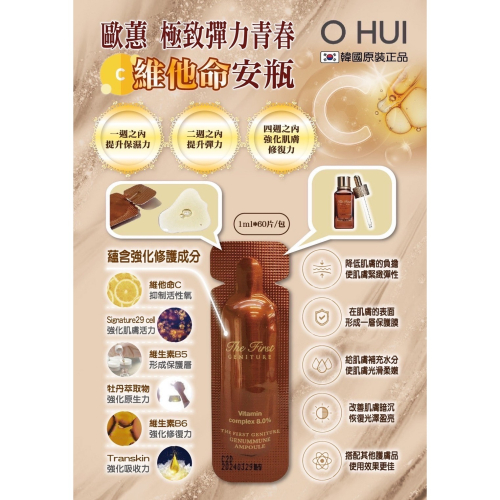 歐蕙研發技術研發的極致彈力安瓶,含8.0%維生素 C、B5、B6 複合物,有助於保護肌膚免受環境中有害物質的侵害,支持肌膚屏障的修護,賦予肌膚明亮、保護肌膚免受外界刺激,保持健康