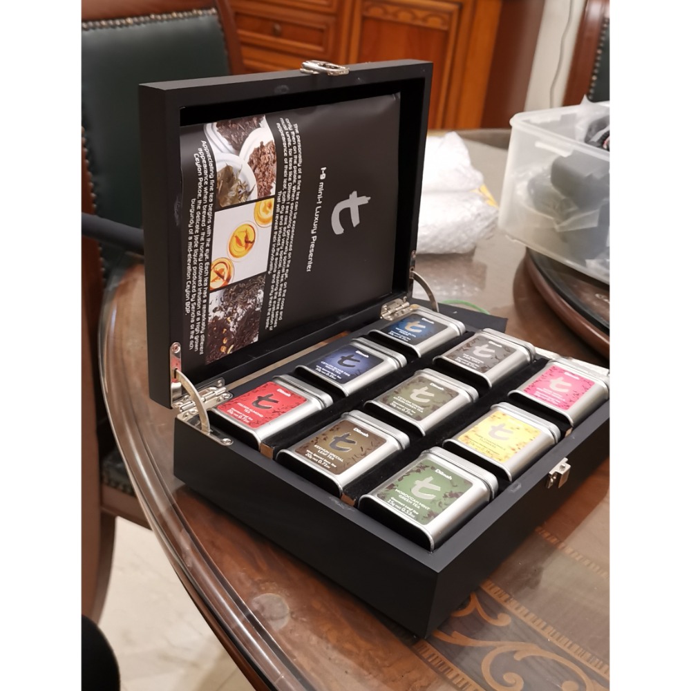 老紅茶,DILMAH帝瑪紅茶木質禮盒,內含九種風味,鐵罐小包裝,每罐容量20公克,國際客戶贈禮,收放倉庫後就忘了他的存在,鐵罐邊緣已有些許銹斑,保存期限至2017年11月13日,介意的買家,恕不接待。