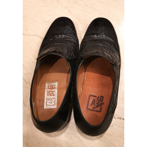 舊時代老皮鞋,阿瘦鱷魚皮男用皮鞋一雙,尺碼五號半,老東西經得起歲月的考驗,要是現今的環保材質早就已經四分五裂,鞋底前方有明顯磨損,需自行請師傅再加底,介意的買家,恕不接待。