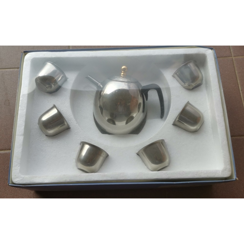 全新商品,不銹鋼雙層中空品茗組,一壺六杯,存放在倉庫很長一段時間,包裝盒已變形,原狀出售,需自行清潔,介意的買家恕不接待。