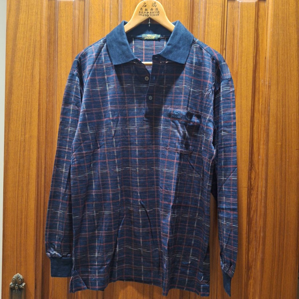 二手JAGUAR 100%純棉男士長袖深藍色格紋Polo衫,尺碼L號.