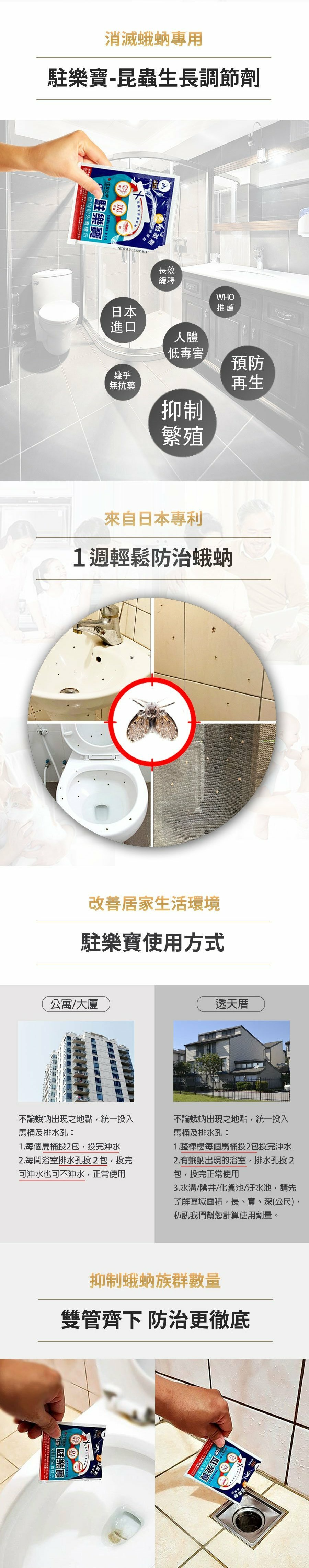 ◆馬桶、排水孔各投2包,蛾蚋幼蟲防治效期長達2~3週