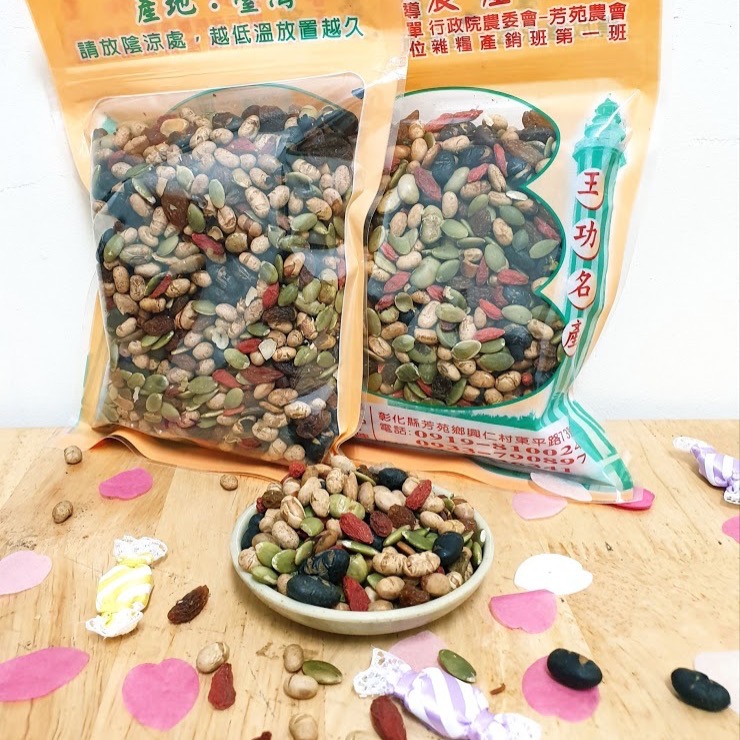 ●成分:黃豆(非基因改造)、黑豆、青豆、葡萄乾、南瓜子仁、枸杞、醬油、甜味劑(醋磺內酯鉀)、鹽、五香粉(大茴香、桂通、花椒、小茴香、丁香、三奈)、辣椒粉、胡椒粉、甘草粉、調味料味精(麩酸鈉、胺基乙酸、琥珀酸二鈉、胺基丙酸、5’-鳥嘌呤核苷磷酸二鈉、5’-次黃嘌呤核苷磷酸二鈉、天門冬酸鈉、檸檬酸鈉、二氧化矽)